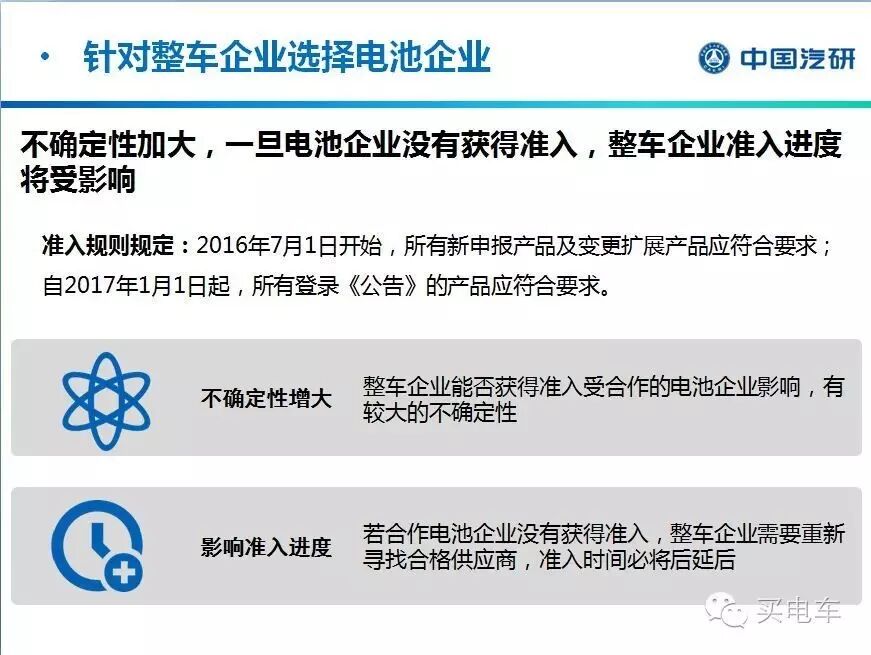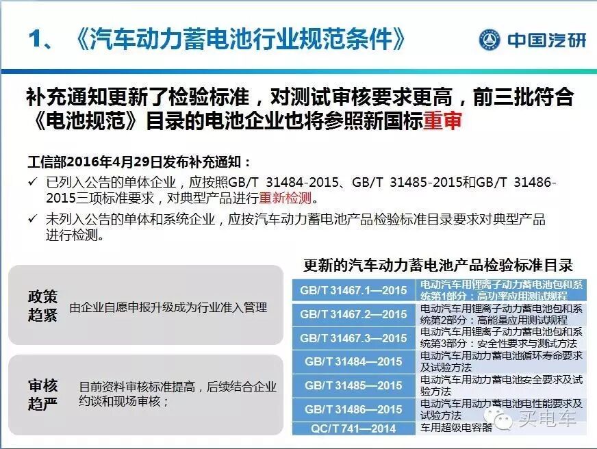 根据2016年3月24日,工信部正式发布的《汽车动力蓄电池行业规范条件》,新能源车型推广目录与《汽车动力蓄电池行业规范条件》捆绑,即采用没有进入目录的电池的新能源汽车产品,从今年5月1日开始,将不进入新能源汽车推广目录,从而无法获得补贴。