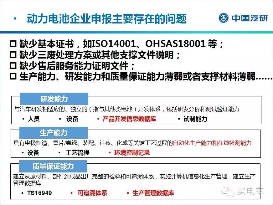 就在日前,中国汽车工程研究院技术经济咨询部副总工程师沈斌透露:“我可以很明确地告诉大家,前四批我们收到了三星、LG等多家企业的准入申请,而且国家也没有对外资、合资企业区别对待,但他们确实没有通过——首先他们都没有通过TS16949认证;另外特别是外资企业,他们在中国主要是进行生产,所以(提交时)缺少详细的研发流程管控方面的材料。”他相信外资、合资品牌解决这些问题之后,一定会通过认证。