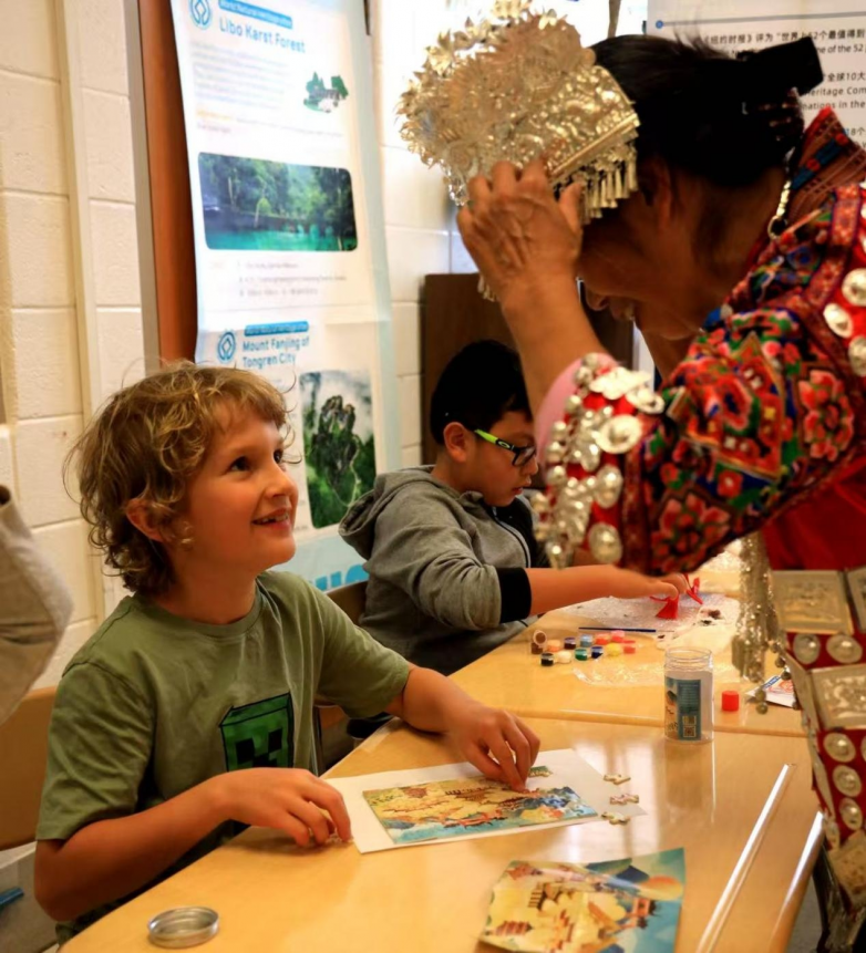 活动当天,身着贵州精美民族服饰的非遗传承人现场为美国青少年学子展示了苗族、侗族等民族的服饰纹样与制作技艺。繁复的刺绣、神秘的蜡染图案、精美的银饰,每一件作品背后都蕴藏着民族的历史与信仰。现场参与体验的双语一年级学生sasha看着苗族银饰头冠兴奋道“我从未见过这样精细的手工,每一个图案好像都在讲述故事”。